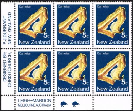 | 1982 Minerals. 5¢ (white paper). UHM plate block of six with two Kiwis. Perfs through bottom selvedge. CP PB5a.