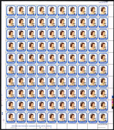 | 1979 14¢ QEII Provisional. UHM full sheet of 100 with double overprint (one very light). The overprints are misplaced upwards. CP PA31a(W), SG 1202a.