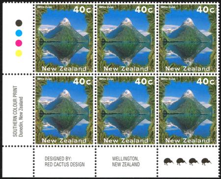 | 1995 40¢ Mitre Peak. UHM plate block of six with four Kiwis. CP PC101a. |