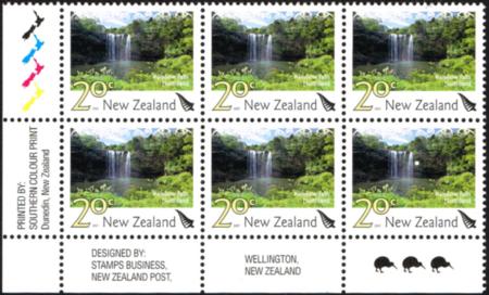 | 2007 20¢ Rainbow Falls. UHM plate block of six with three Kiwis. CP PE76a. |