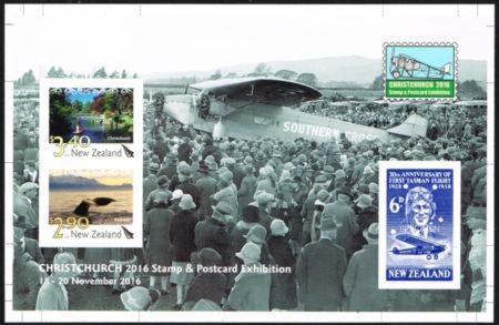 | 2016 Christchurch Stamp and Postcard Show. Single imperforate mini-sheet. UHM. Rare (only 20 single sheets exist). Donated by NZ Post as fundraising for the stamp show. Shows Kingsford-Smith stamp. CP PEM111,112(Z). Catalogue value $750.