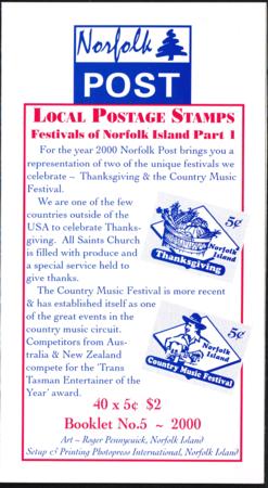 | Norfolk Island. 2000 $2.00 Festivals booklet. Contains four sheets of ten UHM 5¢ stamps. SG SB12. |