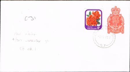 | QEII Stationery Envelope. 4¢. Uprated to 7¢ for the new rates. Posted on the first day of the new rates. (2 Feb 1978). Samuel CF.19a. |