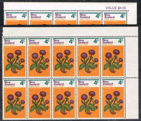 | 1972 4¢ Alpine Plants. Two LHM corner blocks of ten. With and without 'sheet value' in selvedge. |