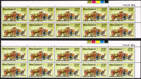 | 1977 23 ¢ Fire Engines. UHM traffic light block of ten, one with the scarce deep olive background shade. With normal as comparison.
