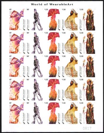 | 2004 World of Wearable Arts. Five sets of five in UHM limited edition imperforate mini-sheet. Two light wrinkles along edge. Scarce. |