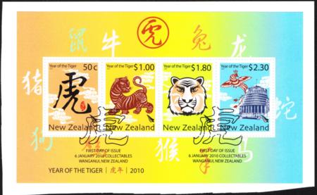 | 2010 'Year of the Tiger' mini-sheet. Fine used on first day of issue. Still attached to part cover SG MS3191.