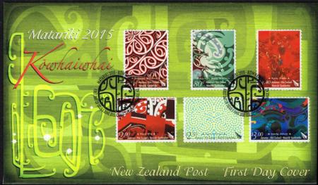 | 2015 Matariki Kowhiwhai. Fine used set of sixself-adhesive stamps on FDC. SG 3684a. |