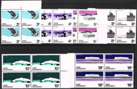 | 1972 Ross Dependency. UHM set of six in blocks of four on chalky paper with gum Arabic adhesive. Usual mixed centring. SG 9/14.