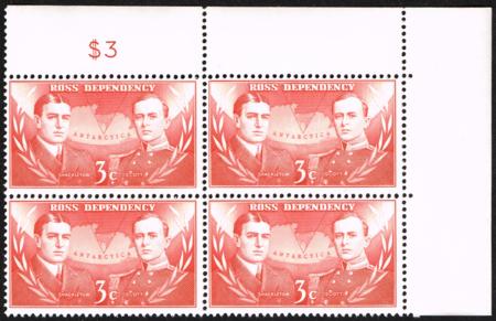| 1967 Antarctic. 1967 3¢ Ross Dependency. UHM sheet value block of four with inverted watermark. Upper left centred. CP RD9a(Z), SG A6w. Catalogue value $500.