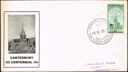 | 1950 Canterbury Centennial cover posted 16 Dec 1950. Jones C50.1E.