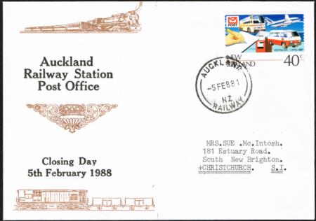 | 1988 illustrated (shows trains) cover for the closing of the Auckland Railways Station Post Office (5 Feb 1988). |