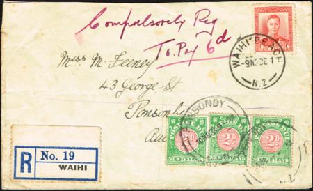 | 1902 postage due 2d in strip of three paying taxe on 'Compulsorily Rgistered' cover (contained coin). 1938. Scarce.
