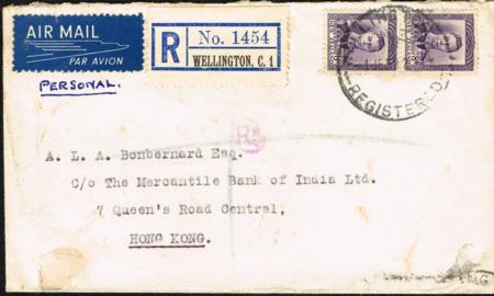 | KGVI 8d pair on 1954 registered airmail cover to Hong Kong. |