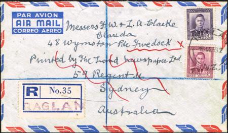 | 4d and 8d KGVI on registered Airmail 1953 cover to Australia. 6d reg. plus 6d airmail. Cover redirected in Australia.