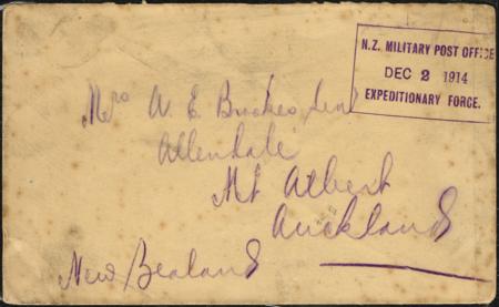 | Cover to NZ with boxed "N.Z. Military Post Office/Expeditionary Force" cachet (DEC 2 1914). Badly toned.