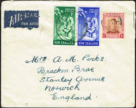 | KGVI 1/- plus 1949 Health set on correct 1/3d rate airmail cover to England. Hidden tear on RHS. |
