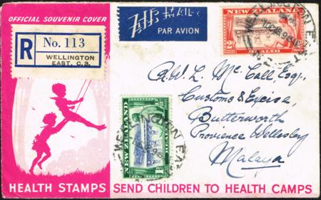 | Health. 1948 First Day Cover. Four sets (front and back) on registered airmail FDC to Penang (Malaya).