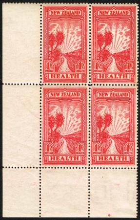 | Health. 1933. UHM corner block of four. Left centred. Perf guide dot in bottom selvedge (normally trimmed off). CP T5a, SG 553. Catalogue value $200.