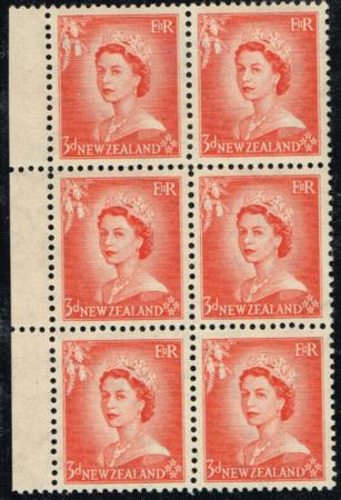 | QEII 3d (stars). ULM block of six (2 x 3) with inv watermark. CP N5a(Z). Cat $1,800. |